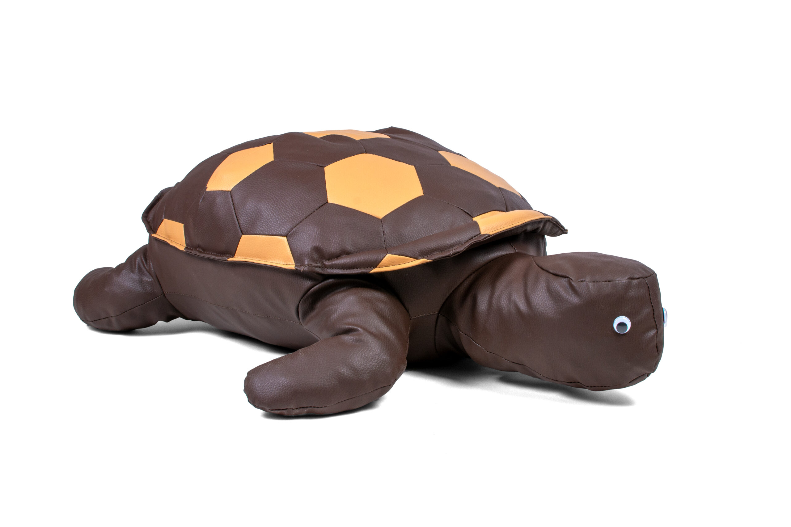 Kilpikonnan muotoinen istuintyyny on valmistettu keinonahasta ja täytetty vanun ja vaahtomuovin sekoituksella.